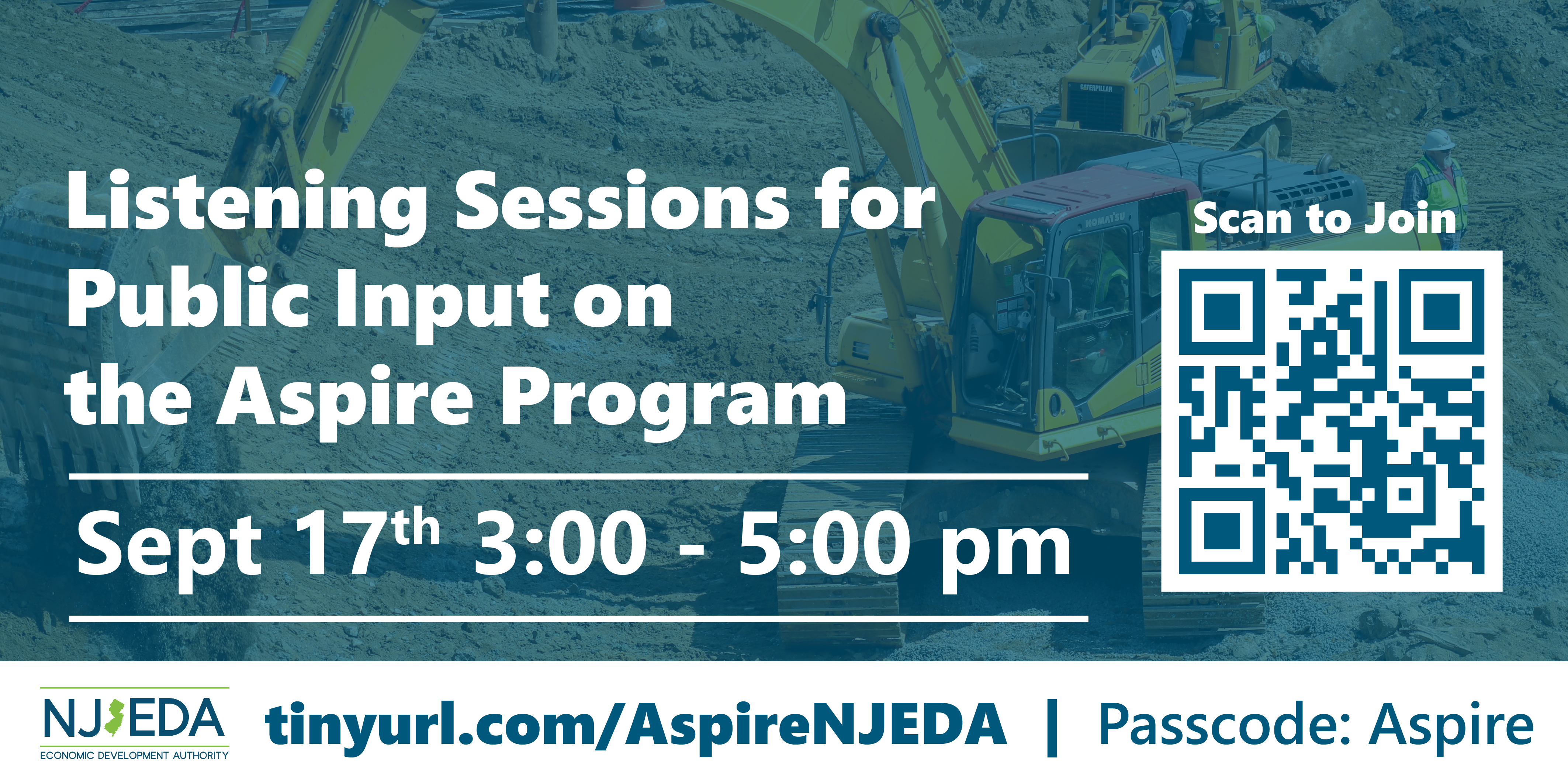 The New Jersey Economic Development Authority (NJEDA) is seeking public feedback on a draft rule proposal for the Aspire Program, as established under the New Jersey Economic Recovery Act of 2020 (ERA). The Aspire Program is a gap financing tool to support commercial, mixed use, and residential real estate development projects. The draft Aspire Program rules are available at https://www.njeda.gov/program-specific-feedback. Members of the public are encouraged to attend this listening session to provide input on the draft Aspire Program rules. The public can also submit written input at https://www.njeda.gov/program-specific-feedback. Passcode: Aspire