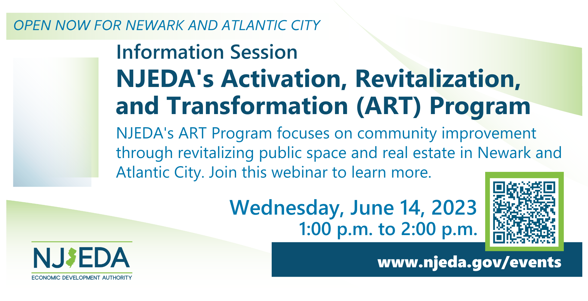 The NJEDA’s Activation, Revitalization, and Transformation (ART) Program establishes a one-time competitive grant opportunity to support economic recovery in urban areas with mass transit that have faced economic harms from the reduction of commuters due to the COVID-19 pandemic. Funded at $10 million, the ART pilot program will address these harms through the creation of two programs, one for Real Estate Rehabilitation and Development projects and one for Public Space Activation initiatives. Projects must be located in Atlantic City or Newark. ART’s Real Estate Rehabilitation and Development program will account for up to 70 percent of the total program funding ($3.4125 million per city) to support project-specific hard and soft costs that revitalize commercial corridors and incentivize catalytic development. ART’s Public Space Activation program will account for up to 30 percent of the total program funding ($1.4625 million per city) to support public space activation initiatives such as placemaking, events, public art installations, signage, streetscape improvements, and small business support. Webinar attendees will hear about the new ART Program and its two focus areas, Real Estate Rehabilitation and Development projects and one for Public Space Activation initiatives. This webinar will discuss the program's eligibility, scoring criteria, minimum and maximum rewards, and overall timeline. More information at https://www.njeda.gov/activation-revitalization-and-transformation-art-program/.