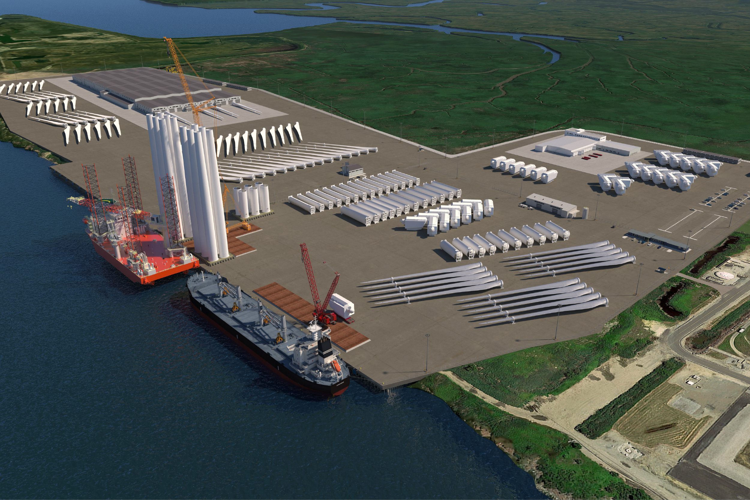 • Purpose-built marshalling Heavy-lift wharfs and component laydown areas